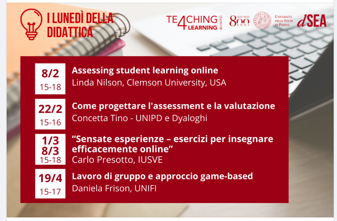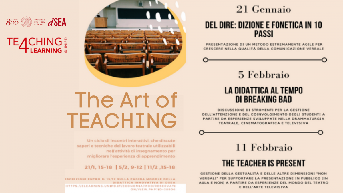 Un ciclo di incontri con gli esperti dell'innovazione didattica rivolti ai docenti e alle docenti del Dipartimento di Scienze Economiche e Aziendali 'Marco Fanno'.Un percorso formativo che si inserisce nel più ampio progetto di sviluppo e di innovazione della didattica, fortemente voluto dal dSEA in sintonia con le linee di sviluppo promosse dall’Unione Europea, dalla European University Association, dal MIUR e dall'Università di Padova (progetto Teaching4Learning@Unipd). Il Dipartimento, infatti, ha deciso di investire sull'innovazione della didattica con il supporto e l’integrazione delle tecnologie più innovative, promuovendo lo sviluppo di una cultura didattica ispirata all’Active Learning e la nascita di una community of practice tra docenti, fondata sulla condivisione di pratiche e sulla formazione continua ispirata ad un approccio student-centered eresearch-based.